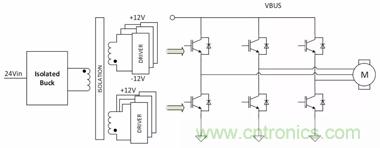 圖13. 使用隔離式降壓轉(zhuǎn)換器、具有隔離式IGBT柵極驅(qū)動(dòng)偏置的3相逆變器