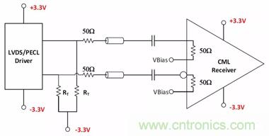 圖14. LVDS/PECL驅(qū)動(dòng)器至CML接收器接口的框圖
