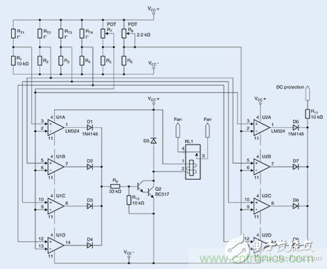 2個(gè)開(kāi)關(guān)閾值的參考值將通過(guò)2個(gè)微調(diào)器,即R7和R8(分別為2.2 k?)進(jìn)行設(shè)置。如上所述,兩個(gè)微調(diào)器將分別產(chǎn)生900?或550?的電阻。至于8個(gè)所需的比較器(U1A-U1D以及U2A-U2D),則采用經(jīng)濟(jì)型LM324放大器。在滿(mǎn)負(fù)荷跳線(xiàn)模式下進(jìn)行的一個(gè)持續(xù)數(shù)小時(shí)的測(cè)試表明,風(fēng)扇能夠在85℃時(shí)可靠地進(jìn)行開(kāi)啟。由于系統(tǒng)具有相對(duì)較低的熱量期限,故而無(wú)需采用常用的滯回比較器電路。