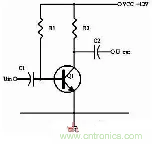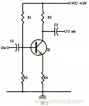 同理,當輸入信號減小時,則Ib減小,Ic電流減小,則電阻R2的電壓U2=Ic×R2會隨之減小,Uce=VCC-U2,會變大。在輸入信減小時,Uce最大變化是從1/2的VCC變化到VCC。這樣,在輸入信號一定范圍內發(fā)生正負變化時,Uce以1/2VCC為準的話就有一個對稱的正負變化范圍,所以一般圖1靜態(tài)工作點的設置為Uce接近于電源電壓的一半。