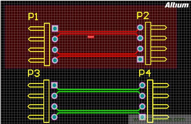 很明顯,2組同樣連線同樣間距的差分對(duì),在Room里的對(duì)象沒(méi)有報(bào)錯(cuò),使用新建Room設(shè)置的規(guī)則。而Room外的對(duì)象依然是報(bào)錯(cuò)狀態(tài)。這就是Room為不同區(qū)域設(shè)置規(guī)則的效果。