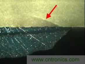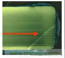因?yàn)镸LCC主要成分是陶瓷,在放置元件,分板,上螺絲等工序中,很可能因?yàn)闄C(jī)械應(yīng)力過大導(dǎo)致電容受擠壓破裂,從而導(dǎo)致潛在的漏電失效。此時(shí)的裂縫一般呈斜線,從端子與陶瓷體的結(jié)合處開裂。