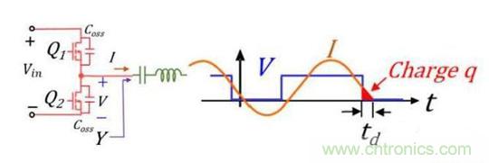 這是因為如果電流I是滯后與電壓V的,這樣在Q1開啟之前電流I為負(fù)值就會charge Q2的Coss,同時discharge Q1的Coss,讓V到Vin,這樣Q1就實現(xiàn)ZVS turn on了。Q2開啟之前,電流I為正,也會discharge Q2的Coss,和charge Q1的Coss,讓V到0,這樣Q2就實現(xiàn)ZVS了。