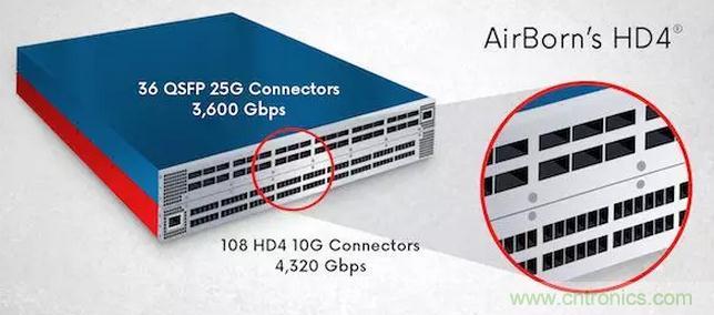 圖2:針對高密度設計的AirBorn 10GHD4®連接器可在同一托架系統(tǒng)內(nèi)提供比25G QSFP連接器更高的吞吐量,從而實現(xiàn)組件和能源成本節(jié)省。