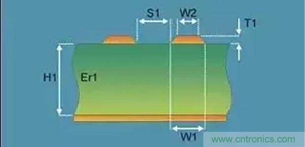 因為差分阻抗影響差分信號的眼圖、信號帶寬、信號抖動和信號線上的干擾電壓。差分線阻抗一般控制在90(±10%)歐姆(具體值參照芯片手冊指導),差分線阻抗與線寬W1、W2、T1成反比,與介電常數(shù)Er1成反比,與線間距S1成正比,與參考層的距離H1正比,如下圖是差分線的截面圖。