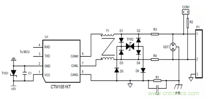 前面只是對ESD的作用機(jī)理進(jìn)行了分析,但隨著工業(yè)產(chǎn)品對通信接口的EMC等級要求越來越高。許多應(yīng)用要求滿足IEC61000-4-2靜電放電4級,IEC61000-4-5浪涌抗擾4級要求。一般的收發(fā)器ESD、浪涌的防護(hù)等級均比較低,如CTM1051M隔離CAN收發(fā)器的隔離耐壓為2500VDC,裸機(jī)情況下,ESD、浪涌等級均較低。所以有必要增加外圍電路,提高通信端口的EMC等級。