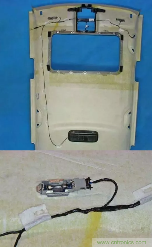 高爾夫的頂棚線束包扎設(shè)計方案為膠帶黏粘到頂棚上進行固定,如下圖所示。