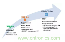 畢竟USB4是下一代USB數(shù)據(jù)規(guī)范,增加了接口帶寬并支持其他協(xié)議共享物理接口。共享USB接口的最大協(xié)議是英特爾的Thunderbolt。自2000年以來,USB-IF一直在系統(tǒng)地提高接口的吞吐量,以滿足客戶不斷增長的數(shù)據(jù)需求。從2000年的USB 2.0開始,到2013年的USB3.2,USB數(shù)據(jù)速率已從480Mbps擴(kuò)展到20Gbps。USB4將進(jìn)一步提高數(shù)據(jù)速率到40Gbps吞吐量。