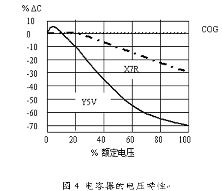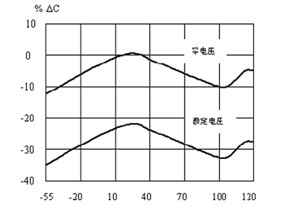 從圖中可以看到,COG電容器的容量幾乎隨溫度沒有變化,X7R電容器的容量在額定工作溫度范圍變化12%以下,Y5V電容器的容量在額定工作溫度范圍內變化70%以上。這些特性是必須注意的,否則會出現(xiàn)濾波器在高溫或低溫時性能變化而導致設備產生電磁兼容問題。