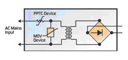 金屬氧化物壓敏變阻器具有高的通流和能量吸收能力,快的響應(yīng)速度,低廉的成本,非常適合在電源端進行過壓保護。PPTC過流保護器件的額定工作電壓也是交流240V,允許最高達265V的間歇性電壓,可以與交流電源輸入線路中的壓敏變阻器安裝在一起。