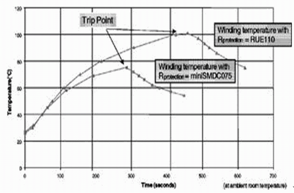 圖2 PPTC元件用于變壓器次級(jí)線圈所發(fā)揮的過(guò)熱保護(hù)特性