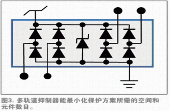 如果產(chǎn)品要在輸入/輸出線中承受某些額外阻抗(如在單端邏輯輸入時經(jīng)常出現(xiàn)的情況),可以通過在外部夾鉗和IC引腳之間增加一個電阻器,使外部和芯片上二極管之間的電流有助于外部防護(hù)(圖2b)。一些TVS二極管供應(yīng)商在單一小型組件包里提供兩個結(jié)型二極管和一個TVS夾鉗,進(jìn)一步減少組件數(shù)目、降低裝配成本,避免互連偏離。這些組件包同樣適用于多軌道情況——單一的組件包為幾條普通供電軌提供保護(hù)(圖3)。