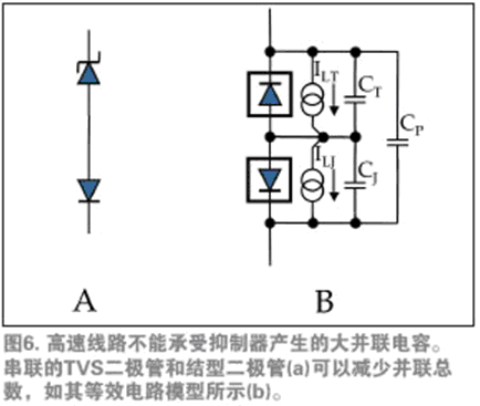 例如,如果某元件僅需要單向運(yùn)行,抑制器制造商可以通過一系列TVS二極管和結(jié)型二極管形成低電容抑制器(圖6a)。在斷開狀態(tài)下,這種結(jié)構(gòu)的純電容等于