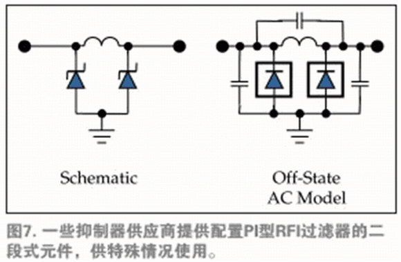 類似圖1b中的片上二段夾鉗結(jié)構(gòu)也應(yīng)用于外部夾鉗,在相同設(shè)備中同時實(shí)現(xiàn)瞬態(tài)超電壓防護(hù)和電磁干擾(EMI)過濾。這種布局是基本的π形網(wǎng)絡(luò),同時,TVS二極管的寄生電容有利于完成EMI過濾。電阻和感應(yīng)網(wǎng)絡(luò)均可直接利用,滿足各種實(shí)體電路層對于信令的具體要求(圖7)。抑制器供應(yīng)商通常按照通信標(biāo)準(zhǔn)在選擇器向?qū)е袑υ右詤^(qū)分,確保適當(dāng)?shù)膸捄湍承┨匦宰杩沟膽?yīng)用。