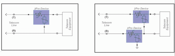 2Pro器件符合RoHS標準,它把PolySwitch PPTC過流保護技術(shù)和金屬氧化物壓敏變阻器(MOV)集成在一起,構(gòu)成一個過熱保護器件,在出現(xiàn)過流現(xiàn)象時抑制電流,在發(fā)生過壓現(xiàn)象時對電壓進行箝位。這種單器件做法,有助于減少元件數(shù)量、提高設備的可靠性。圖1說明了在不接地和接地兩種電路保護方案中如何使用2Pro器件。