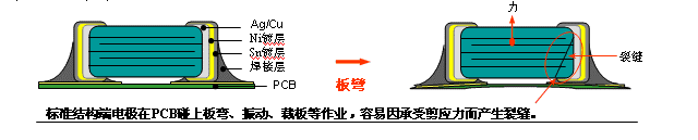 - 為電容端電極增加“彈性層”有效吸收外應(yīng)力,降低裂縫的發(fā)生機(jī)率