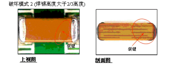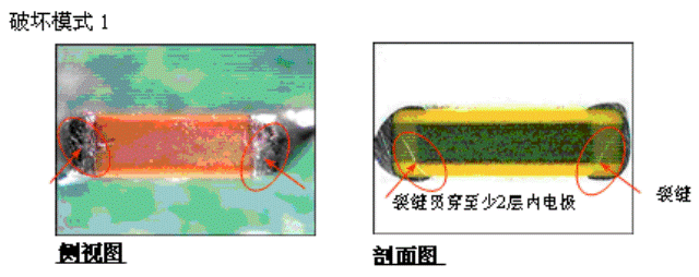 貼片式陶瓷電容的內(nèi)部裂縫能引起嚴(yán)重的破壞。如果在PCB組裝過(guò)程中,貼片式陶磁電容器招受到剪應(yīng)力,一種板彎裂縫將會(huì)在陶磁內(nèi)部產(chǎn)生,這些裂縫有可能貫穿電容內(nèi)部多層內(nèi)部正負(fù)電極層,這樣可能導(dǎo)至短路的風(fēng)險(xiǎn)。典型的板彎破壞裂縫模式如下圖所示。這些短路模式可能導(dǎo)至電容過(guò)熱而造成嚴(yán)重的燒毀熔融現(xiàn)象。