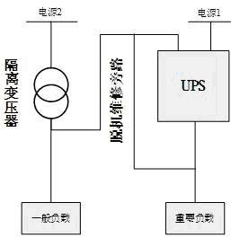 如圖一所示,這個是石化行業(yè)典型的兩電源的UPS構架,由兩路電源,一個隔離變壓器、一臺UPS組成。UPS采用雙電源回路輸入,UPS主電源由電源1提供,UPS旁路電源有電源2提供,同時UPS設置一個脫機維修旁路,允許UPS在故障維修或者更換時,系統(tǒng)仍然能夠正常工作。同時DCS系統(tǒng)中的負載分為兩個級別,即一般負載和重要負載,重要負載(一級負荷)由UPS系統(tǒng)直接供電,一般負載(三級負荷)由電源2經隔離變壓器后供電。