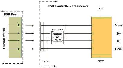 這個辦法的實(shí)質(zhì)是在USB接口附近連接一個保護(hù)元器件。它由幾支采用軌對軌結(jié)構(gòu)的二極管組成,本身具有低電容的特性。內(nèi)部鉗位器件為兩條數(shù)據(jù)線提供±25kVESD(ISO10605)保護(hù)功能,以及為Vbus電源線提供保護(hù)功能。