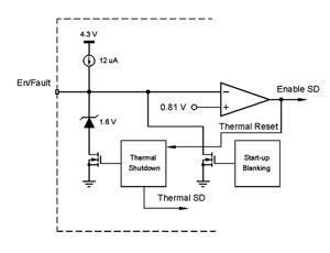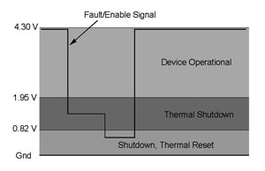 目前的器件有熱閂鎖電路,在發(fā)生熱故障時會關(guān)閉器件。然后芯片能通過下拉啟用引腳至地并釋放熱,或是重新啟動輸入電源來重啟。