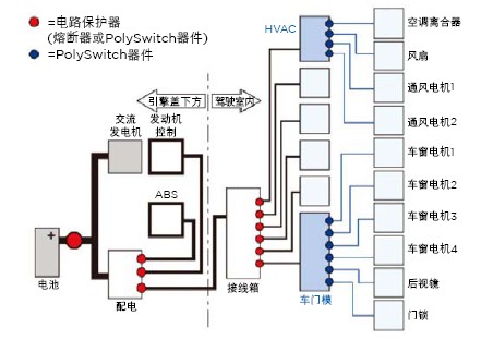 由于PolySwitch器件的采用不再需要經(jīng)過便于用戶接近的中央熔斷器座進(jìn)行配電布線,因此可以按照電源與負(fù)載之間最直接的路徑完成布線。從而縮短了電線長度,減小了電線規(guī)格,不僅節(jié)省了大量空間、尺寸和成本,也減少了車輛中使用的各種端子、觸點(diǎn)、開關(guān)和電子驅(qū)動電路。此外,分散式架構(gòu)還可以減少所需的連接器和接線箱數(shù)量及尺寸。比如,通過在車門模塊中采用PolySwitch器件,可以使用一條電力饋線,節(jié)省了電線,降低了成本和接線箱尺寸。