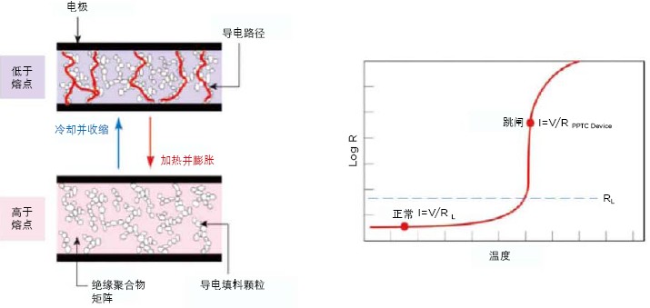 圖4. PolySwitch通過從低阻狀態(tài)轉(zhuǎn)變?yōu)楦咦锠顟B(tài)來響應(yīng)過流或過溫條件,幫助保護(hù)電路