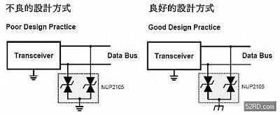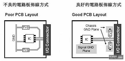 (圖一) TVS二極管的箝位效能可以透過將元件安排在接近輸出入連接點(diǎn),并將連接TVS的走線長度縮短而提高。