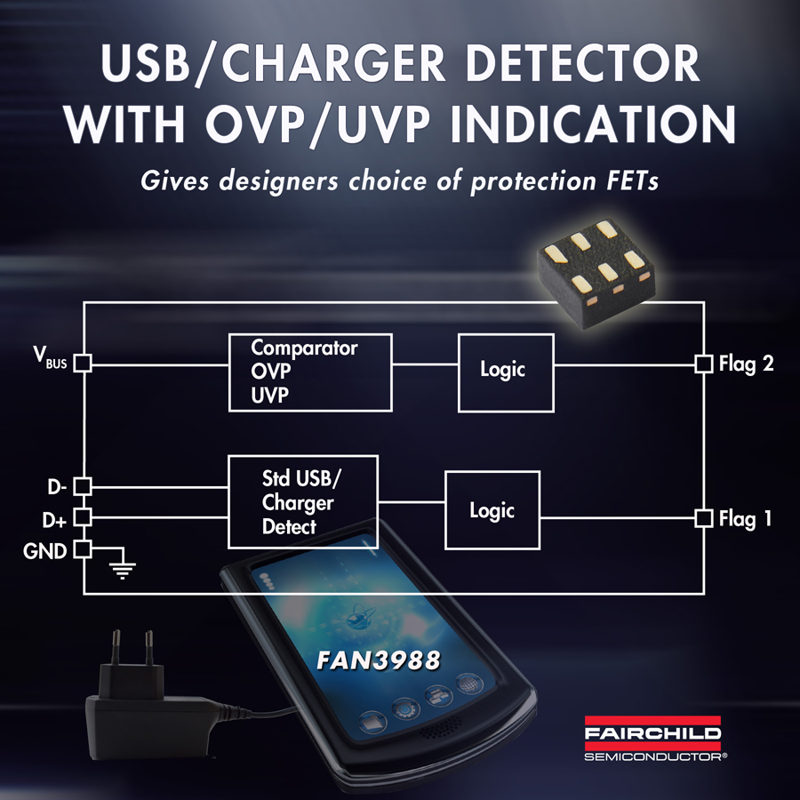 飛兆半導(dǎo)體公司(Farichild Semiconductor) 為手機(jī)和手持移動產(chǎn)品設(shè)計人員提供一款帶有高集成度過電壓保護(hù)(OVP)和USB/充電器檢測功能的器件FAN3988。該器件是飛兆半導(dǎo)體OVP產(chǎn)品系列的最新成員,可讓終端用戶按照應(yīng)用所需之特定導(dǎo)通電阻和電流能力,靈活選擇外部P溝道MOSFET。