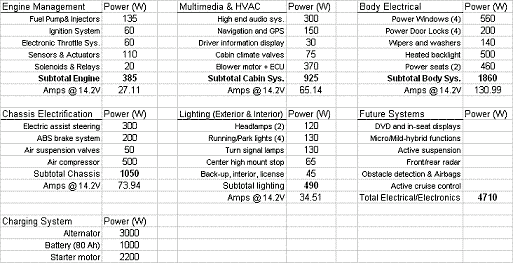 關(guān)于該表要注意的最后一點(diǎn)是:如果考慮車身電子、照明和底盤電子等子系統(tǒng)的間歇性負(fù)載,對(duì)汽車充電系統(tǒng)的需求就真的是附件超載(accessoryoverload)。將來(lái)的系統(tǒng)將持續(xù)這種趨勢(shì)。