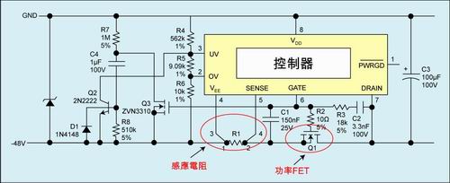 圖3:采用NTC熱敏電阻進行過熱保護的典型離散熱插拔電路。