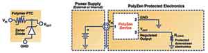 新一代增強(qiáng)聚合物齊納二極管也可以保護(hù)敏感的電子器件免于被感應(yīng)電壓尖峰、瞬態(tài)過壓、不正確的供電和極性接反等所損壞。如圖1所示,PolyZen器件包括一個用于電壓鉗位的穩(wěn)壓齊納二極管和一個非線性PPTC薄膜器件。