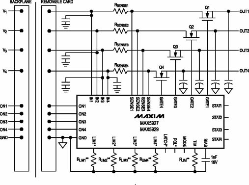 Maxim公司推出了一系列電源熱插拔控制器,適應(yīng)于各種背板電源的要求。MAX5927/5929是針對(duì)低壓電源系統(tǒng)的+1V到13.2V的四通道熱插拔控制器。在電路板熱插拔時(shí),MAX5927/5929控制輸出電壓緩慢升高,同時(shí)限制輸入電流小于預(yù)設(shè)值,避免瞬態(tài)大電流沖擊,保證了系統(tǒng)的安全性和穩(wěn)定性。圖1是典型應(yīng)用電路圖,圖2是熱插拔時(shí)的啟動(dòng)電壓、電流波形??梢钥闯?,MOSFET的柵極電壓受MAX5927/5929的控制,按照固定斜率上升,逐漸打開(kāi)MOSFET,輸出到電路板的電壓也基本同步地按斜率上升,瞬態(tài)電流則始終被控制在門(mén)限值以?xún)?nèi),避免了大的沖擊電流的出現(xiàn)。啟動(dòng)時(shí)間和電流限值都可以簡(jiǎn)單地通過(guò)一個(gè)外部電阻來(lái)設(shè)定,為設(shè)計(jì)工程師提供了極大的靈活性。