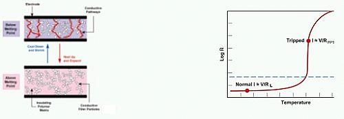 此時電阻可增加到原值的1000倍以上或更高倍數(shù)。電阻增加后,電路中的電流值減至可在故障情況下流動的一個較低且穩(wěn)定的狀態(tài),因而保護(hù)了設(shè)備。在元件轉(zhuǎn)變?yōu)楦咦柚禒顟B(tài)下,可稱之為“已動作”。元件將保持已動作(高阻值)狀態(tài),直到故障清除并將設(shè)備的電源斷開,此時,導(dǎo)電性聚合物冷卻下來并重新結(jié)晶,將PPTC元件恢復(fù)到較低阻狀態(tài)下,而受影響的設(shè)備也恢復(fù)到正常運(yùn)作狀態(tài)。