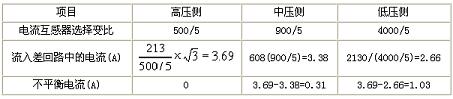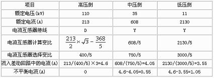 實例:一臺三相三繞組降壓變壓器,容量Se=40.5MVA,電壓110±2×2.5%kV/385±2×2.5%kV/11kV,接線方式:Ydd11-11,變壓器額定電流:213A/608A/2130A。主變差動保護采用BCH-2型差動繼電器。基本計算如表1所示,已確定110kV側(cè)為基本側(cè)。