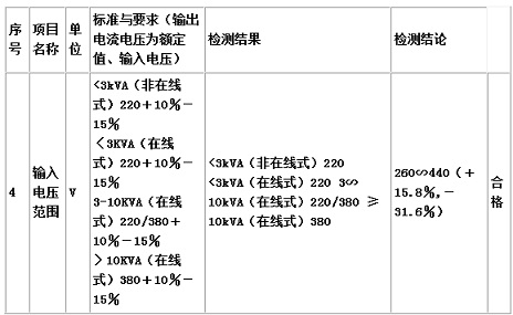 (2)寬輸入電壓范圍。輸入電壓允許范圍為+15%~-30%,在中大功率UPS當(dāng)中還未見到另一品牌UPS經(jīng)過權(quán)威單位檢測達到此指標(biāo),如附表所示。