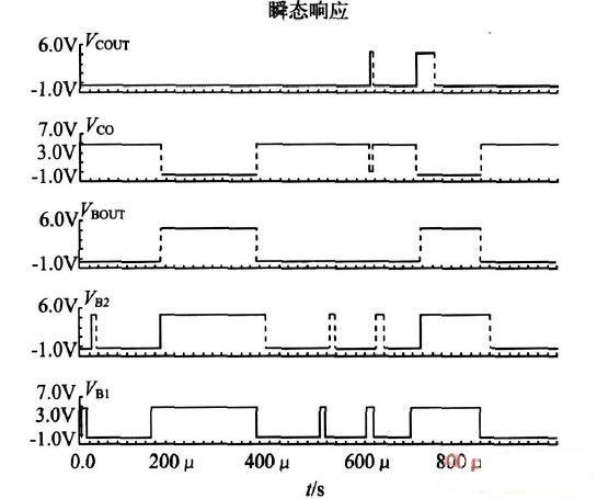 “屏蔽”模式的邏輯關(guān)系如圖4 所示,其中VB1和VCOUT 分別為比較器甲和乙的輸出信號(hào),VB1 經(jīng)過(guò)一個(gè)延遲時(shí)間后輸出信號(hào)為VB2,屏蔽電路輸出電壓為VBOUT,VCO為屏蔽電路的輸出端。VB1、VB2和VBOUT的波形反應(yīng)了屏蔽電路的邏輯關(guān)系,只有當(dāng)VB1 和VB2 同時(shí)為高電平,VBOUT 才為低電平,否則VBOUT 一直為高電平,因此屏蔽電路屏蔽了延遲時(shí)間內(nèi)的脈沖信號(hào),保持寬脈沖信號(hào);VCOUT為使能端,只要VCOUT為高電平,VCO 立即變?yōu)榈碗娖健?/p>