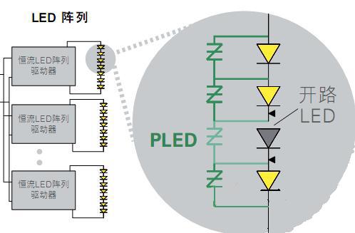 以上方案能夠有效的應(yīng)對電源部分產(chǎn)生的浪涌威脅,保護LED免受損壞。但是我們都知道,LED燈等通常由一定數(shù)量的LED管串接或并聯(lián)組成陣列,單個LED損壞會造成的整個LED陣列的停止工作。因此在LED陣列端,LF專門為LED開路研制了PLED LED開路保護器,如圖所示: