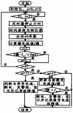 漏電流檢測的流程圖如圖3所示。漏電流信號過零點后,開始AD采樣轉(zhuǎn)換,根據(jù)定時器測得漏電流和工作電壓之間的時間差計算相位差,得到漏電流的大小,將連續(xù)3個周期同一時刻的值分別與突變電流和緩變電流的設(shè)定值作比較,判斷當(dāng)前是否發(fā)生漏電;若漏電,漏電由緩變電流引起還是突變電流引起;若大于整定值則立刻斷電并顯示系統(tǒng)當(dāng)前故障值并報警等。