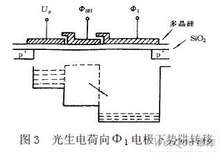如圖3 所示,MOS 電容中的信號電荷包通過轉(zhuǎn)移柵轉(zhuǎn)移到模擬移位寄存器的Φ1 電極下的勢阱中。當(dāng) ΦSH 由高變低時,ΦSH 低電平形成的淺勢阱將存儲柵下勢阱與Φ1 電極下的勢阱隔離開。存儲柵勢阱進入光 積分狀態(tài),而模擬移位寄存器將在Φ1 與Φ2 脈沖的作用下驅(qū)使轉(zhuǎn)移到Φ1 電極下勢阱中的信號電荷向左轉(zhuǎn)移, 并經(jīng)輸出電路由OS 電極輸出。由于結(jié)構(gòu)上的安排,OS 端首先輸出13 個虛設(shè)單元信號,再輸出51 個暗信號, 然后才連續(xù)輸出S1 到S2160 的有效像素單元信號。第S2160 信號輸出后,又輸出9 個暗信號,再輸出2 個奇 偶檢測信號,以后便是空驅(qū)動??镇?qū)動數(shù)目可以是任意的。由于該器件是兩列并行分奇、偶傳輸?shù)?,所以?一個ΦSH 周期內(nèi)至少要有1118 個Φ1 脈沖,即TSH>1118T1。ΦR 為復(fù)位級的復(fù)位脈沖,復(fù)位一次輸出一個 信號。