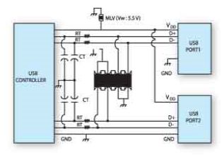 許多高速數(shù)據(jù)應用和終端產(chǎn)品采用混合式保護方式,在數(shù)據(jù)和時鐘線上采用基于間隙的器件,在電源連接部分采用多層壓敏電阻或基于硅的瞬態(tài)電壓抑制二極管。例如,USB接口的D+和D–線要求高速保護,這可以采用分立的芯片利用附加的多層壓敏電阻或瞬態(tài)電壓抑制器件用于VDD電源保護。PC、筆記本電腦、上網(wǎng)本等產(chǎn)品中常常需要多個USB接口連接。