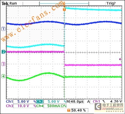 圖2的波形代表一個工作電路。放大器的輸出之一(上跟蹤,深藍(lán)色)是一個1kHz正弦波直流偏壓為2.5V。第二次跟蹤(青色)是線束上看到的信號。這也從一開始就是在2.5V直流偏置一個1kHz正弦波,但200μs是一個18V電源短路。第三次跟蹤(洋紅色)是分流穩(wěn)壓器輸出,最初在11V的偏見,但拉回應(yīng)過壓條件地面。第四次跟蹤(綠色)線束的電流。最初是一個正弦波,電流下降到零這個回應(yīng)過壓條件。