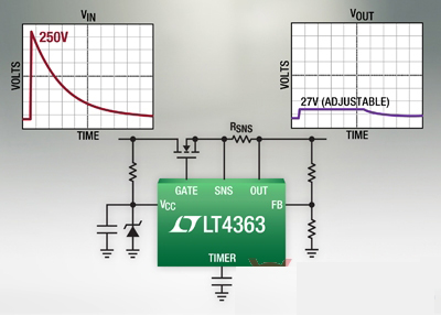 近日,凌力爾特公司推出過壓保護(hù)控制器 LT4363,該器件為高可用性電子系統(tǒng)提供了過壓和過流保護(hù)。當(dāng)流過長電感性電源總線的電流突然變化時(shí),就會(huì)發(fā)生電源電壓浪涌。另外,汽車電池還會(huì)經(jīng)歷一種稱為負(fù)載突降的情況,在這種情況下,電壓會(huì)在持續(xù)多個(gè) ms 的時(shí)間里處于上升狀態(tài)。傳統(tǒng)的保護(hù)電路依靠笨重的電感器、電容器、保險(xiǎn)絲和瞬態(tài)電壓抑制器。而 LT4363 通過簡單地控制一個(gè) N 溝道 MOSFET,實(shí)現(xiàn)了可靠、自適應(yīng)和節(jié)省空間的設(shè)計(jì)。只有控制器和 MOSFET 經(jīng)受高壓浪涌,下游組件可以提供較低電壓的額定值,因此節(jié)省了成本。