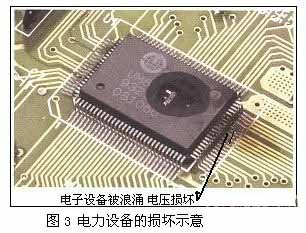 ⑵ 電力設(shè)備的損壞。干擾信號和浪涌對電路的不利影響是每一個電力工程師都不能忽視的問題。在過去繼電器的短時間過載輸入可能是沒有危險的,但是在使用半導(dǎo)體電路的時代里,即使是低能量脈沖也能造成損壞或操作失敗,其損壞見圖3所示。