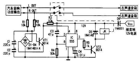 1.在接通音響電源的瞬間,因電容C3兩端電壓不能突變,可視為短路,則時(shí)基電路555的②、⑥腳電位高于2/3 Vcc,故555處于復(fù)位狀態(tài),③腳輸出低電平,晶體管VT2截止,繼電器JK常開(kāi)觸點(diǎn)不動(dòng)作。同時(shí)+12 V電壓通過(guò)電阻R4向電容C3充電,延時(shí)約5s(秒鐘)后555的②、⑥腳電位降低至1/3Vcc,555被觸發(fā)置位,③腳由低電平變?yōu)楦唠娖剑w管VT2導(dǎo)通,繼電器JK得電,常閉觸點(diǎn)閉合,從而實(shí)現(xiàn)了延遲一段時(shí)間將揚(yáng)聲器接入功放,徹底消除了開(kāi)機(jī)時(shí)大電流對(duì)揚(yáng)聲器的沖擊;