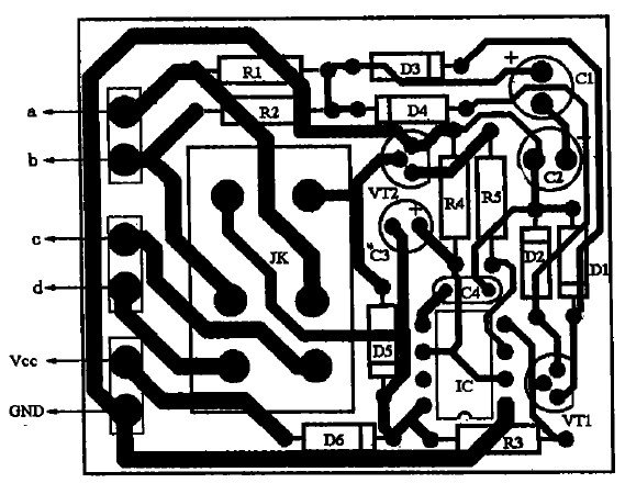 具體制作如下:先把功放輸出端與音箱的引線切斷,按圖2所示電路將引線頭a、b分別接功放的兩組輸出端,c、d分別接左、右聲道音箱:揚(yáng)聲器保護(hù)電路的電源只能從收放機(jī)中獲取,不可直接從汽車(chē)12 v電源中獲取,否則不起開(kāi)/關(guān)機(jī)保護(hù)作用;若是柴油車(chē)所配置的收放機(jī)(使用24 V電源),則要求增加一個(gè)降壓電路(見(jiàn)圖3所示),給揚(yáng)聲器保護(hù)電路供電,以免電源電壓過(guò)高損壞IC。