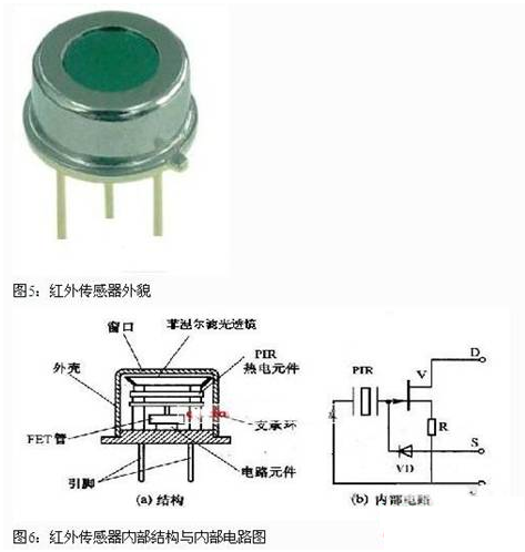 被動式紅外傳感器有三個關(guān)鍵性的元件:菲涅爾濾光透鏡,熱釋電紅外傳感器(PIR)和匹配低噪放大器。菲涅爾透鏡有兩個作用:一是聚焦作用,即將熱釋紅外信號折射在PIR上:二是將探測區(qū)內(nèi)分為若干個明區(qū)和暗區(qū),使進入探測區(qū)的移動物體(人)能以溫度變化的形式在PIR上產(chǎn)生變化的熱釋紅外信號。一般還會匹配低噪放大器,當探測器上的環(huán)境溫度上升,尤其是接近人體正常體溫(37℃)時,傳感器的靈敏度下降,經(jīng)由它對增益進行補償,增加其靈敏度。輸出信號可用來驅(qū)動電子開關(guān),實現(xiàn)LED照明電路的開關(guān)控制。圖5是紅外傳感器外貌,圖6 是紅外傳感器內(nèi)部結(jié)構(gòu)與內(nèi)部電路圖。圖7 是帶紅外傳感器的LED照明燈具,這是一款E27標準螺口燈頭的燈具,它的電源適用范圍是 AC180V-250V (50/60Hz), 紅外傳感器檢測范圍大約在3M—15M,它的標準產(chǎn)品 IFS-Bulb 3W燈具達80 lm ,5W燈具達140 lm 。在LED光源模塊的中央部分嵌入紅外線傳感器。一旦紅外傳感器檢測到人的體溫,LED電燈泡將會在50秒內(nèi)自動開啟與關(guān)閉。適用于任何一種室內(nèi)應(yīng)用,如走廊、儲藏室、樓梯和大廳入口處。
