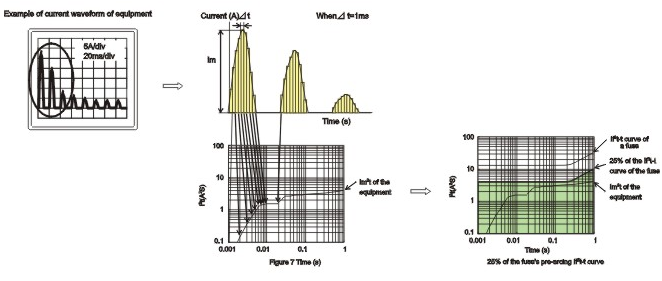 由于開關(guān)電源的出現(xiàn),使得線路中的浪涌電流變得復(fù)雜,多變,不同的浪涌電流或工作電流波形產(chǎn)生的能量是不同的,電路設(shè)計(jì)者要了解回路中出現(xiàn)的浪涌電流或工作電流的波形,以適當(dāng)?shù)剡x擇熔斷的工作電流。參照圖 (3)