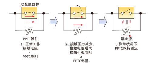 在正常狀態(tài)下,由于雙金屬片的電阻低,電流通過雙金屬片流過。在異常情況下,比如電動工具轉(zhuǎn)子堵轉(zhuǎn)時,電路中將產(chǎn)生很高的電流,導致雙金屬觸點打開,其接觸電阻增加。此時電流將通過低電阻的PPTC流過。流過PPTC的電流,不僅抑制了觸點之間電弧的產(chǎn)生,同時又加熱雙金屬片,使其保持在打開狀態(tài)和鎖定位置。