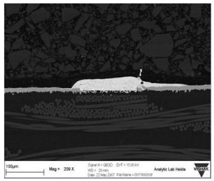 厚膜電阻的使用經(jīng)驗(yàn)表明,短時過載、焊接熱等熱應(yīng)力和脈沖應(yīng)力會使阻值發(fā)生漂移。這些在貼片式保險絲里發(fā)生的現(xiàn)象將會改變保險絲的特性,進(jìn)而縮短熔斷時間。雖然熔體使用了幾種不同的材料,例如銅錫合金,可以達(dá)到高水平的I2T,但在持續(xù)的熱應(yīng)力之后,熔體對斷開時間的縮短是非常敏感的。這是由于應(yīng)力會導(dǎo)致熔體組成材料的遷移,如圖2所示,該圖顯示了在施加脈沖負(fù)載應(yīng)力之后,銅錫合金正在發(fā)生遷移的情況。