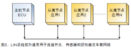 LIN總線拓撲利用一臺獨立主機或ECU(電子控制單元)以及多個節(jié)點,如圖3所示。連接應用模塊至車載網(wǎng)絡使其可進行診斷和提供服務。